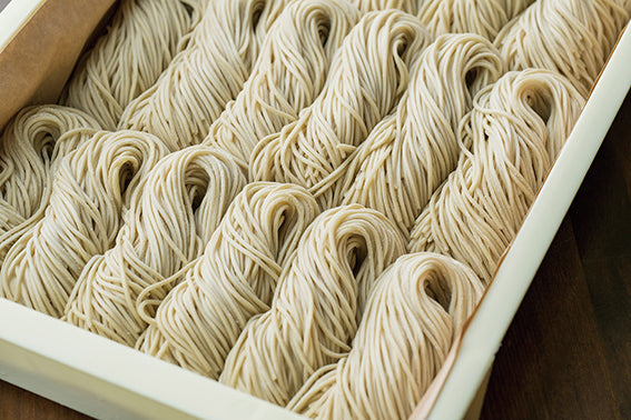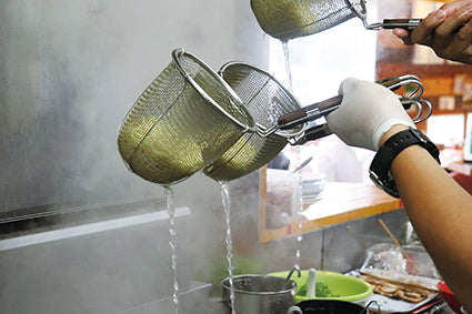 モチモチとした食感で中太麺の、のど越しが特徴の自家製麺です。小麦本来の風味と食感にこだわり、防腐剤、保存料などを一切使わずに作っています。